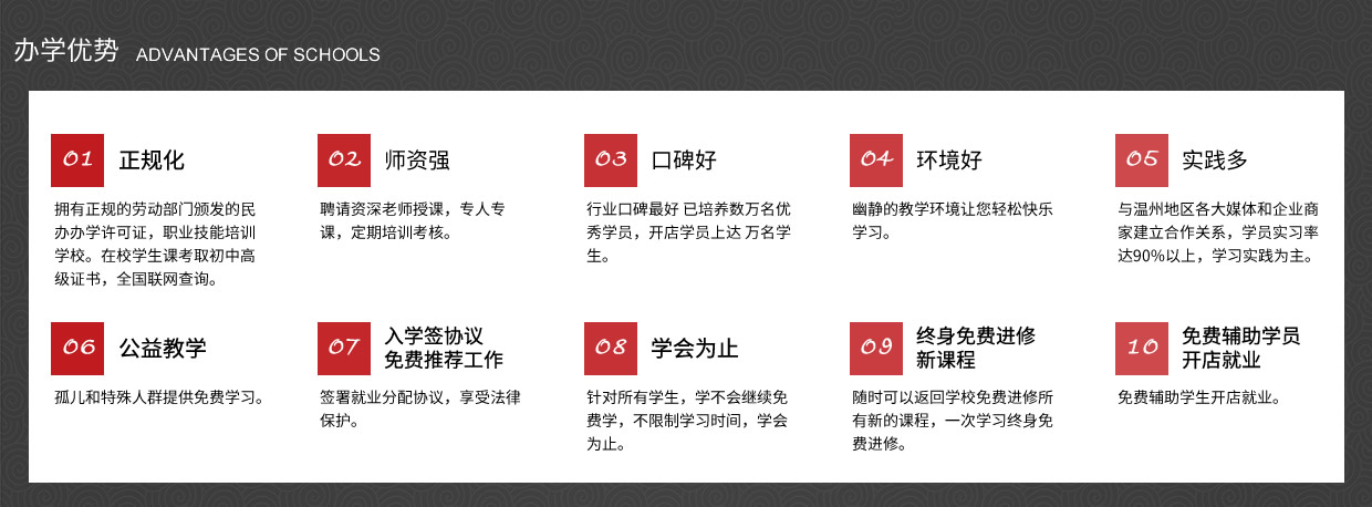我校以培養(yǎng)實(shí)用型專業(yè)人才為目標(biāo),理論學(xué)習(xí)、操作訓(xùn)練與專業(yè)實(shí)踐三位一體,實(shí)行一對(duì)一的教學(xué)模式,常年招生,男女不限。畢業(yè)后推薦工作、 主要是以理論為輔實(shí)操為主的教學(xué)模式授課。老師手把手教、一對(duì)一輔導(dǎo),為學(xué)員量身定做課程,保證學(xué)會(huì)為止、 中途不收取任何費(fèi)用,(無(wú)任何隱形消費(fèi))進(jìn)修新的課程。、簽約教學(xué)、幫助學(xué)員開(kāi)店就業(yè),免費(fèi)試學(xué)(讓您全方位的體驗(yàn)我們的專業(yè)、讓你不花一分冤枉錢。)